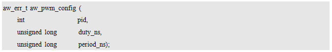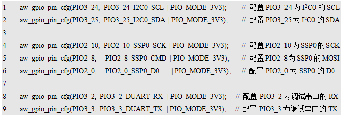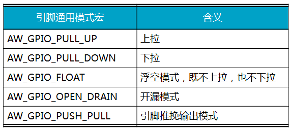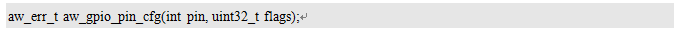 其中,pin为引脚编号,flags为配置的功能和模式标志,返回值为标准的错误号,返回AW_OK时表示配置成功,否则,表示配置失败,配置失败可能是由于部分功能和模式不支持造成的。