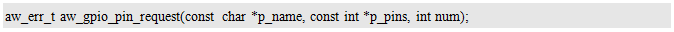 其中,p_name为申请者的名字,p_pins指向引脚列表,num为本次申请的引脚个数。返回值为标准的错误号,返回AW_OK时表示申请成功,可以正常使用相关的引脚,否则,表示申请失败,相关引脚已经被占用,无法使用。
