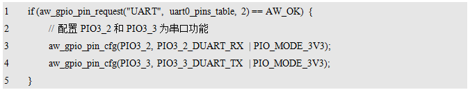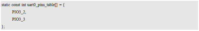 p_pins为引脚列表,例如,要申请PIO3_2和PIO3_3这两个引脚用作串口功能,则引脚列表可以定义为: