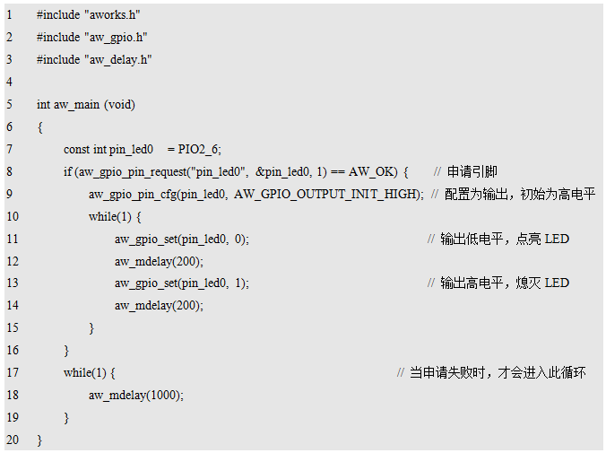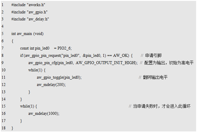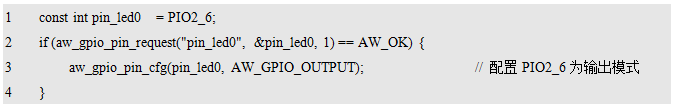 关于需要申请引脚的时机,一个简单的原则就是:在调用aw_gpio_pin_cfg()前,都应该确保已经向系统申请到该引脚的使用权。