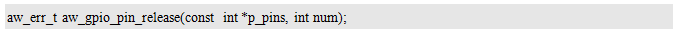 其中, p_pins指向引脚列表,num为本次释放的引脚个数。返回值为标准的错误号,返回AW_OK时表示释放成功,否则,表示释放失败,可能是由于参数错误导致的。