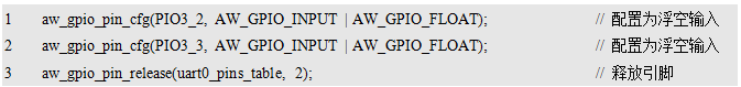 在释放引脚前,可以将I/O口配置为通用GPIO功能,以使其不再作为串口的功能引脚。特别注意,这一配置操作只能在释放前完成,释放后将失去引脚的控制权,不可再对其进行配置操作。