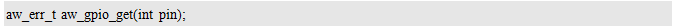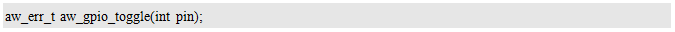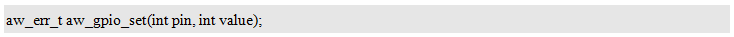 其中,pin为引脚编号。value为设置的值,当value为0时,输出低电平,否则,输出高电平。返回值为标准的错误号,返回AW_OK时表示设置成功,否则,表示设置失败。