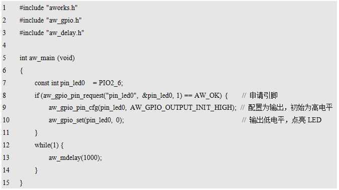 这里通过GPIO的输出控制LED,仅为介绍GPIO接口的使用方法。实际中,AWorks已经定义了通用的LED接口,在应用中操作LED时,均建议使用通用的LED接口。