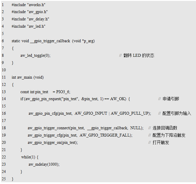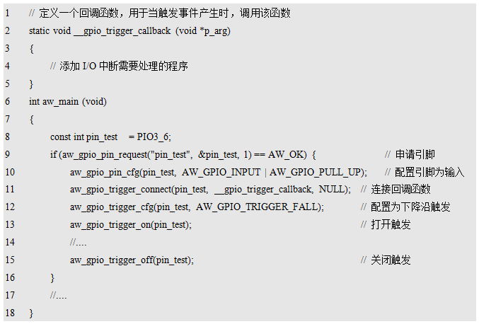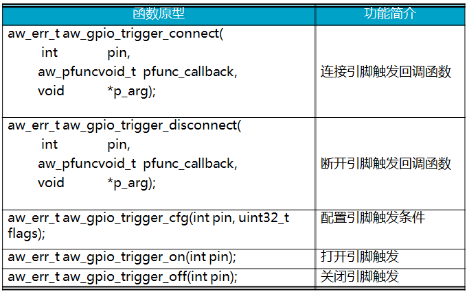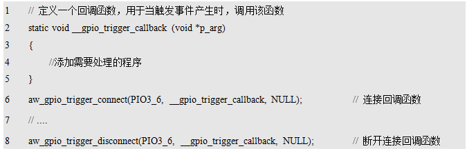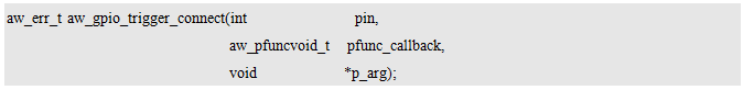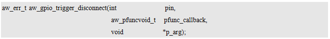 其中,pin为引脚编号,pfunc_callback为指向回调函数的指针,其指向的函数即为本次连接的回调函数,p_arg为传递给回调函数的用户参数。返回值为标准的错误号,返回AW_OK时表示连接成功,否则,表示连接失败,失败可能是由于该引脚不支持触发模式。
