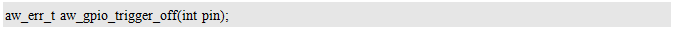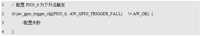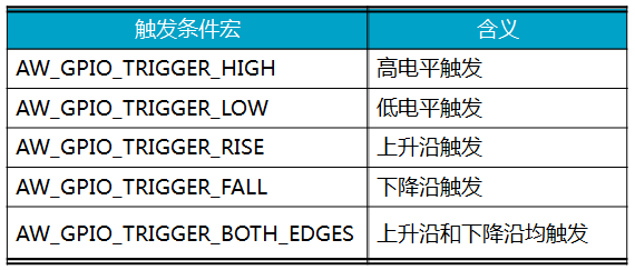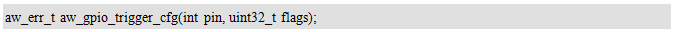 其中,pin为引脚编号,flags用于指定触发条件。返回值为标准的错误号,返回AW_OK时表示配置成功,否则,表示配置失败,配置失败可能是由于该引脚不支持配置的触发条件。
