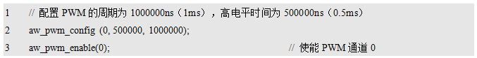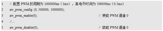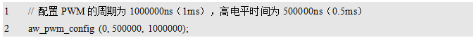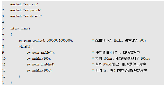 这里通过控制PWM的输出驱动蜂鸣器发声,仅为介绍PWM接口的使用方法。实际中,AWorks已经定义了通用的蜂鸣器接口,在应用中操作蜂鸣器时,均建议直接使用通用的蜂鸣器接口。