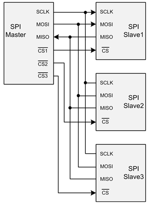 一个主机可以连接多个从机,多个从机共用SCLK 、MOSI、MISO三根信号线,每个从机的片选信号CS是独立的,因此,若主机需要连接多个从机,就需要多个片选控制引脚。连接示意图详见图7.5。当一个主机连接多个从机时,同一时刻最多只能使一个片选信号有效,以选择一个确定的从机作为数据通信的目标对象。也就是说,在某一时刻,最多只能激活寻址一个从机,以使各从机之间相互独立的使用,互不干扰。