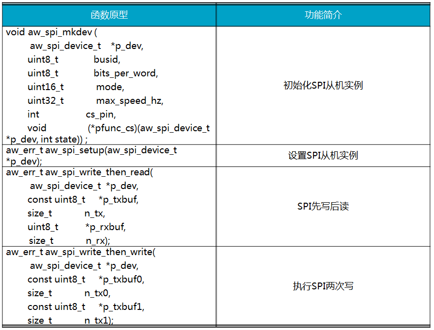 绝大部分情况下,MCU都作为SPI主机与SPI从机器件通信,因此这里仅介绍AWorks中将MCU作为SPI主机的相关接口,接口原型详见表7.12。