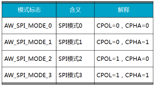 mode为从机使用的SPI模式(模式0 ~ 模式3,对应的宏定义详见表7.13),从机器件一般支持固定的一种或几种SPI模式,这里的mode用于指定使用何种SPI模式与从机器件通信。