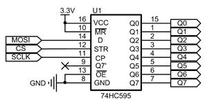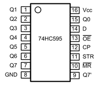 要获取这些信息,就必须查看芯片相关的数据手册和相应的硬件电路。74HC595是一种常用的串行输入/并行输出转换芯片,其引脚分布图详见图7.8。