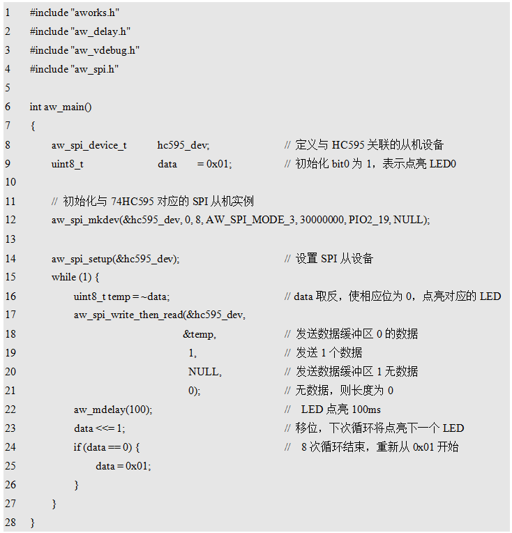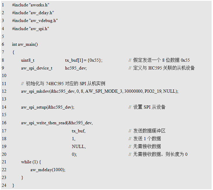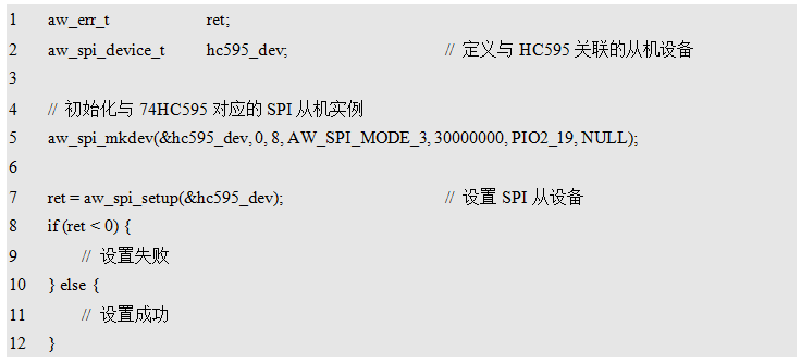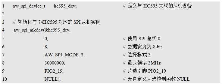 基于以上信息,可以定义并初始化一个与74HC595对应的SPI从机器件实例,范例详见程序清单7.20。
