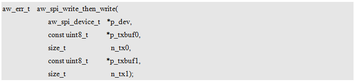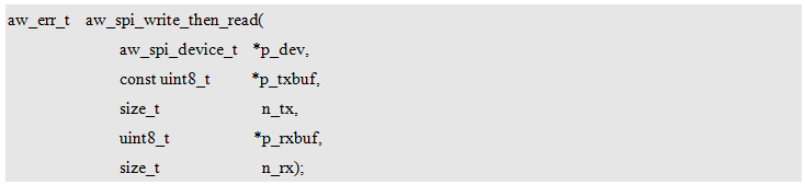 其中,p_dev指向从机器件实例,表示本次数据通信的目标对象,p_txbuf0指向需要首先写入从机的数据,n_tx0为写入数据的字节数。p_txbuf0指向数据发送完成后,开始发送下一段数据,p_txbuf1指向需要再次写入从机的数据,n_tx1为写入数据的字节数。返回值为标准的错误号,返回AW_OK时表示数据传输成功,否则,表示数据传输失败。