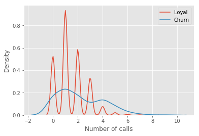 fig.set(xlabel='Number of calls', ylabel='Density')