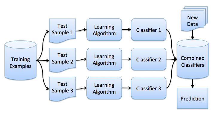 假设我们有一个训练集X。我们使用bootstrap生成样本X1, ..., XM。现在,我们在每个bootstrap样本上分别训练分类器ai(x)。最终分类器将对所有这些单独的分类器的输出取均值。在分类情形下,该技术对应投票(voting):