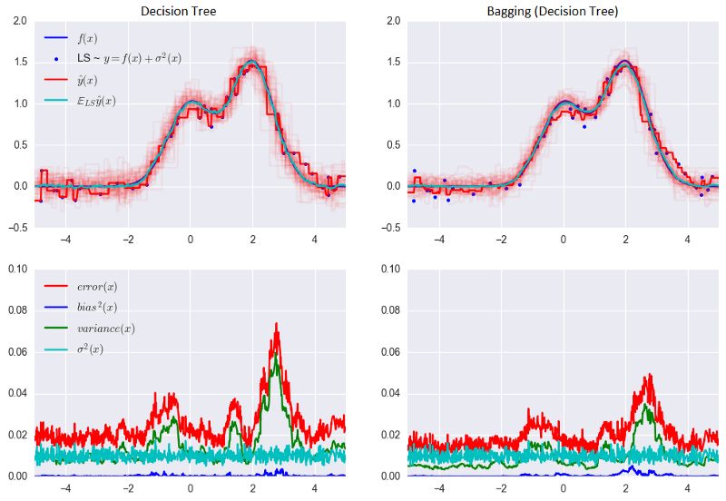 bagging通过在不同数据集上训练模型降低分类器的方差。换句话说,bagging可以预防过拟合。bagging的有效性来自不同训练数据集上单独模型的不同,它们的误差在投票过程中相互抵消。此外,某些bootstrap训练样本很可能略去离散值。