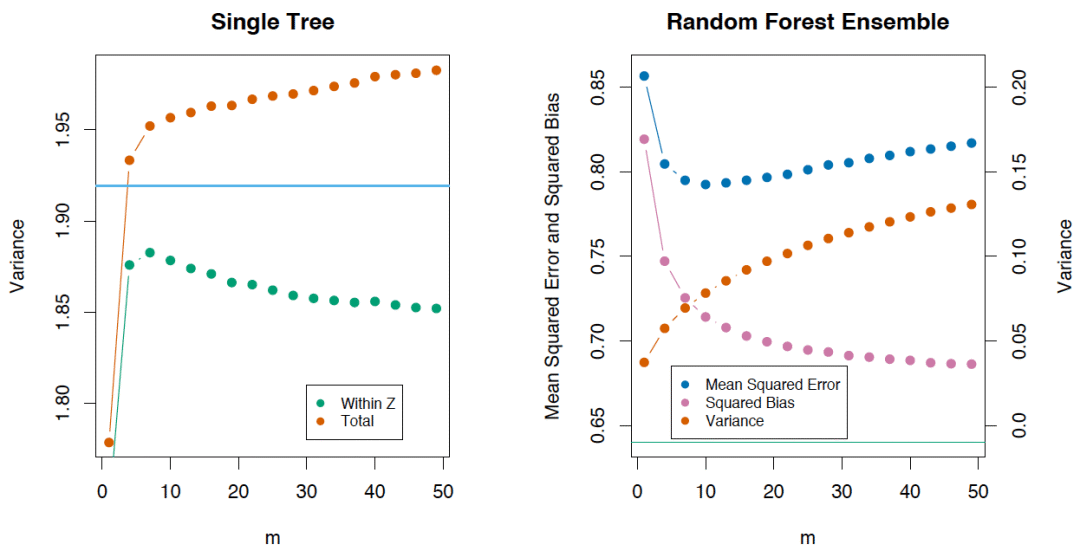 如果我们考虑单棵树的方差,它几乎不受分割参数的影响(m)。但这一参数在集成中是关键。另外,单棵决策树的方差要比集成高很多。The Elements of Statistical Learning一书中有一个很好的例子: