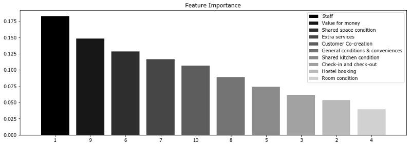 上图显示,消费者常常更为关心服务人员和性价比。这两个因子对最终评分的影响最大。然而,这两项特征和其他特征的差别不是非常大。因此,排除任何特征都会导致模型精确度的下降。基于我们的分析,我们可以建议旅馆业主重点关注服务人员培训和性价比。