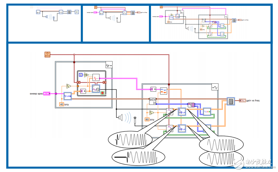 如果我们可以在LabVIEW中放置一个抽象设计节点并编辑它的图标来表示麦克风,用另一个图标来表示扬声器,为声波添加一些剪贴画,我们可以快速生成一个草图。
