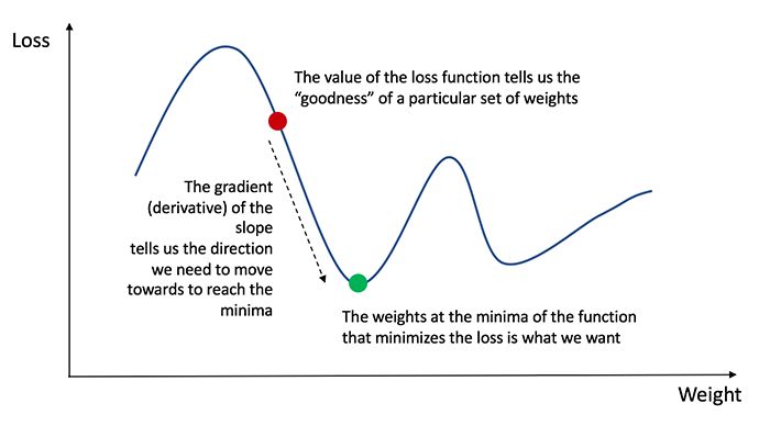 为了确定权重和偏置调整的适当值,我们需要知道损失函数对权重和偏置的偏导数。