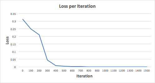如果我们将神经网络进行 1500 次迭代,看看会发生什么。下图展示了每次迭代的损失函数值,我们可以清晰地发现损失函数单调下降到最小值。这与我们前面讨论的梯度下降算法是一致的。