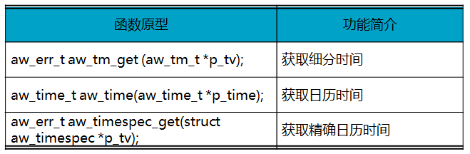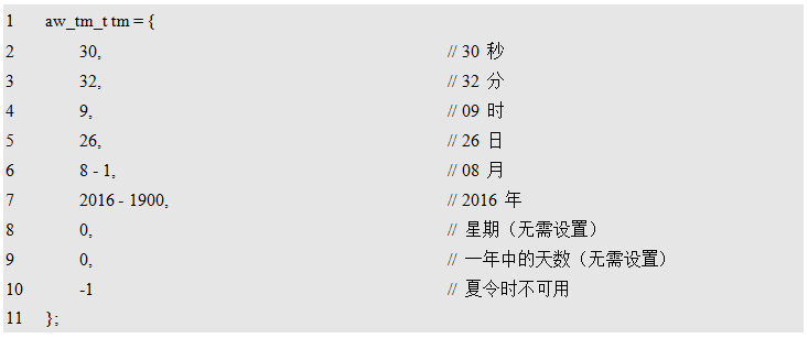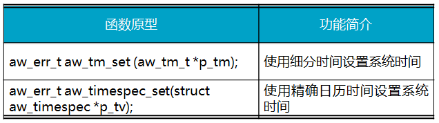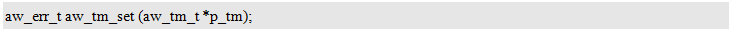 其中,p_tm为指向细分时间(待设置的时间值)的指针。函数返回值为标准的错误号,返回AW_OK时表示设置成功,其它值表示设置失败。