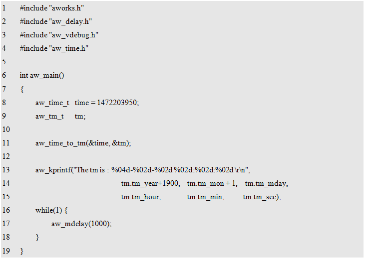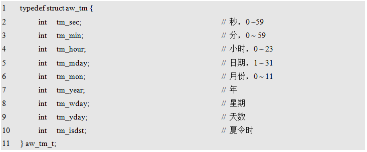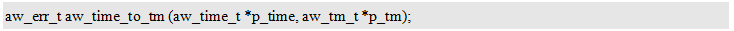其中,p_time作为输入参数,指向待转换的日历时间;p_tm为输出参数,用以输出转换的结果(细分时间)。函数返回值为标准的错误号,返回AW_OK时表示转换成功,其它值表示转换失败。