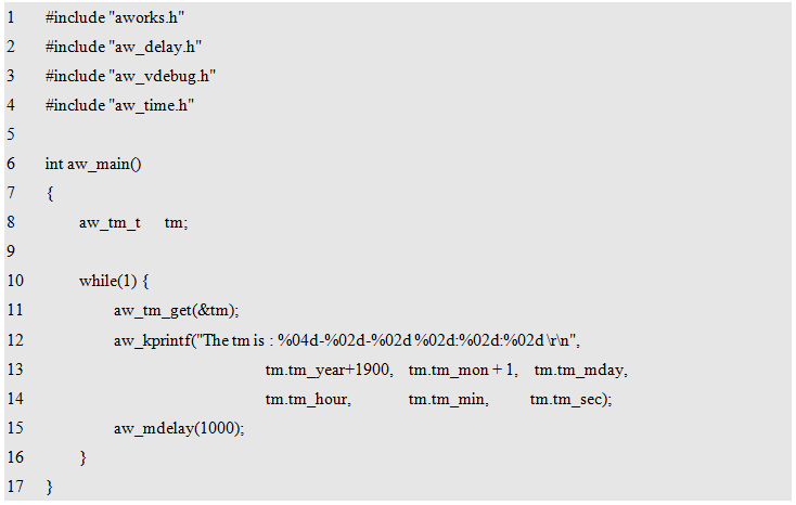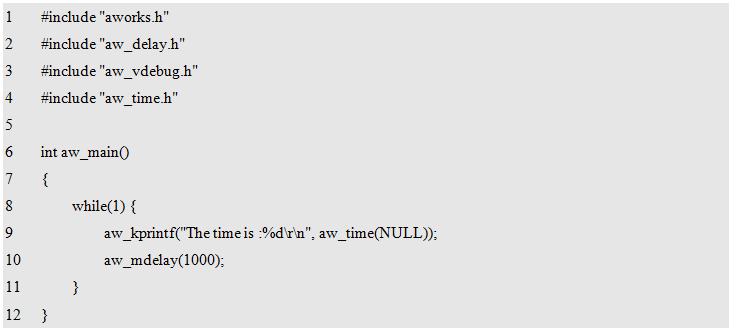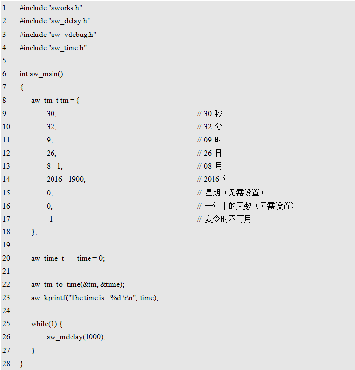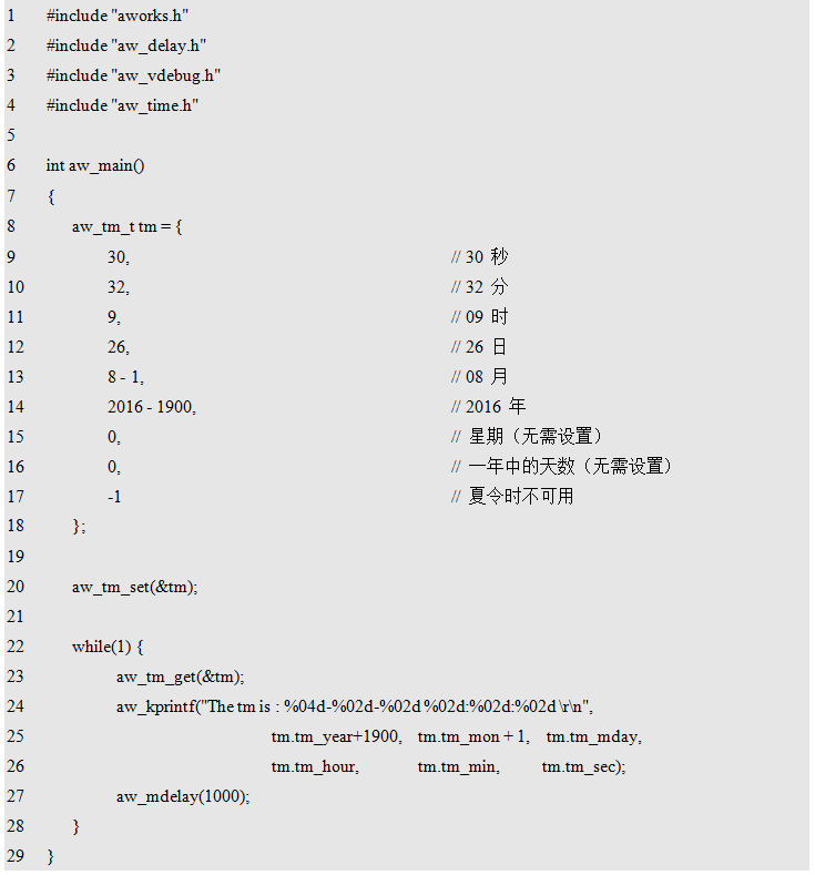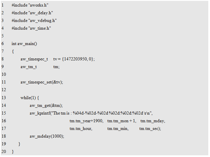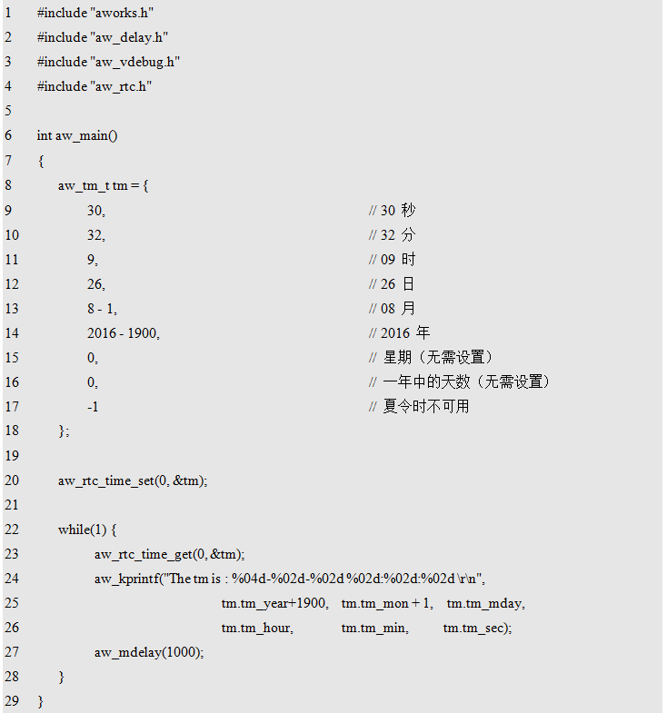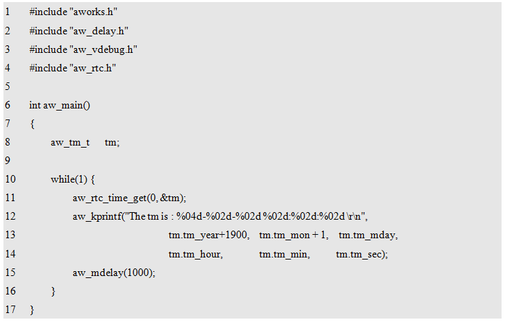 其中,p_tv为指向精确日历时间(待设置的时间值)的指针。函数返回值为标准的错误号,返回AW_OK时表示设置成功,其它值表示设置失败。范例程序详见程序清单8.11。
