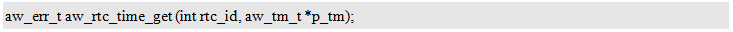 其中,rtc_id表示RTC设备的编号,系统为每个RTC设备都分配了一个唯一ID,通常都是从0开始顺序为各个RTC设备编号。例如,i.MX28x片内具有RTC外设,其可以作为一个RTC设备使用,若还使用I²C总线外接了PCF85063器件,则系统中将新增一个RTC设备,此时,系统中共计将有2个RTC设备,它们的编号分别为0、1。p_tm为指向细分时间的指针,其为输出参数,用以返回获取到的时间值,返回值为标准的错误号,返回AW_OK时表示获取成功,否则表示获取失败,失败的原因可能是该rtc_id对应的设备不存在。