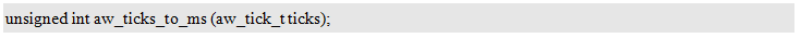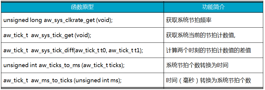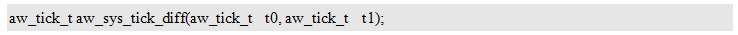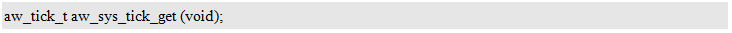 函数返回值即为当前系统节拍计数器的值。aw_tick_t为一个无符号整数类型。其位数与具体平台相关,在32位系统中,其往往定义为32位。