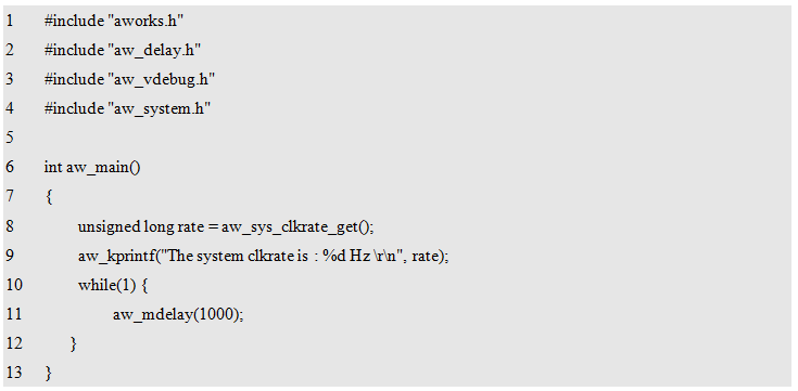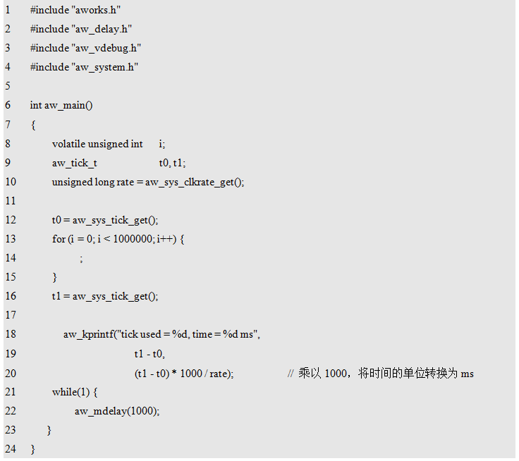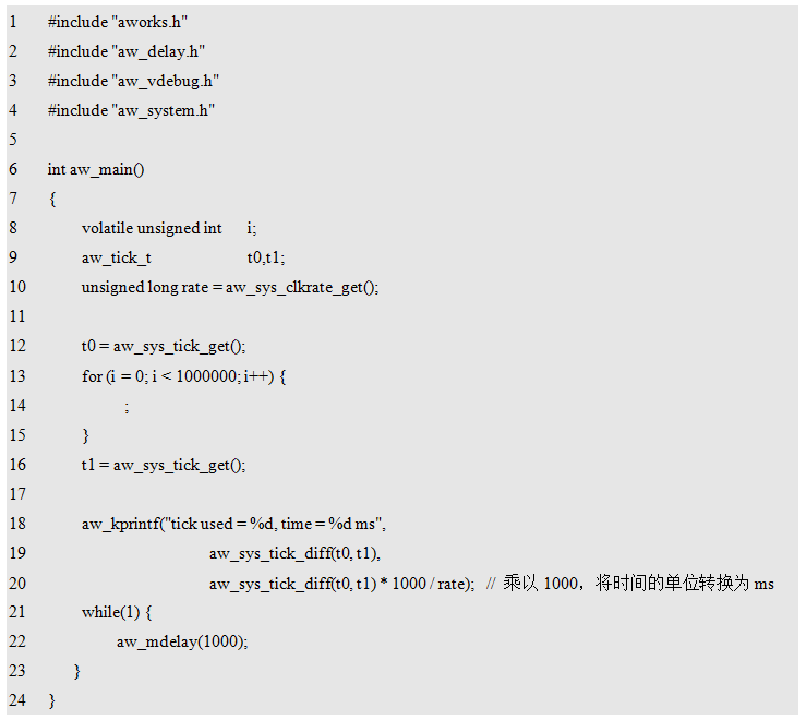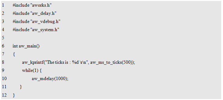 程序中,节拍差值和对应的时间都通过手动计算,实际中,为了方便用户使用,AWorks提供了相关操作对应的接口函数。