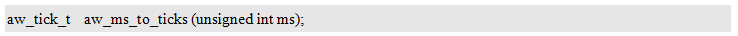 与将系统节拍个数转换为时间对应,AWorks提供了用于将时间(单位:毫秒)转换为系统节拍个数的接口,其函数原型为: