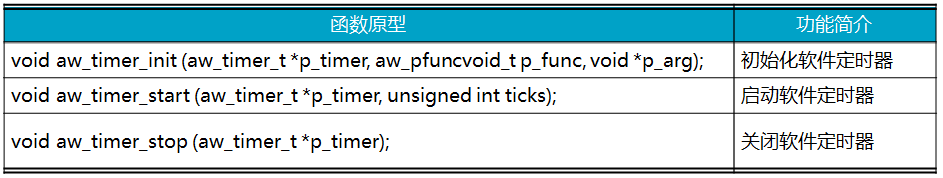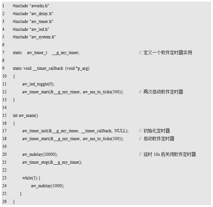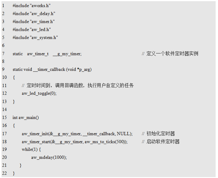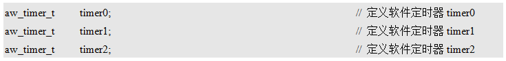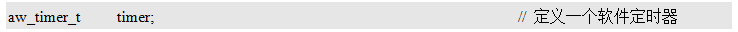 在使用软件定时器前,必须定义一个软件定时器实例,软件定时器的类型为aw_timer_t,其在aw_timer.h文件中定义,具体类型的定义用户无需关心,仅需使用该类型定义软件定时器实例即可,即: