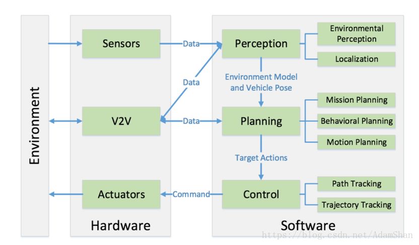 无人驾驶系统的核心可以概述为三个部分:感知(Perception),规划(Planning)和控制(Control),这些部分的交互以及其与车辆硬件、其他车辆的交互可以用下图表示: