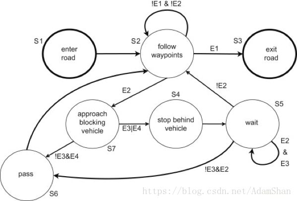 如上图所示,每个状态都是对车辆动作的决策,状态和状态之间存在一定的跳转条件,某些状态可以自循环(比如上图中的循迹状态和等待状态)。虽然是目前无人车上采用的主流行为决策方法,有限状态机仍然存在着很大的局限性:首先,要实现复杂的行为决策,需要人工设计大量的状态;车辆有可能陷入有限状态机没有考虑过的状态;如果有限状态机没有设计死锁保护,车辆甚至可能陷入某种死锁。