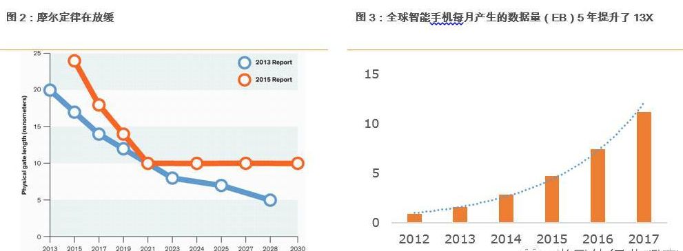 然而时至今日,人类精密制造领域(半导体制造是目前为止人类制造领域的最巅峰)遇到硅基极限的挑战,摩尔定律的放缓似乎预示着底层架构上的芯片性能的再提升已经出现瓶颈,而数据量的增长却呈现指数型的爆发,两者之间的不匹配势必会带来技术和产业上的变革升级。