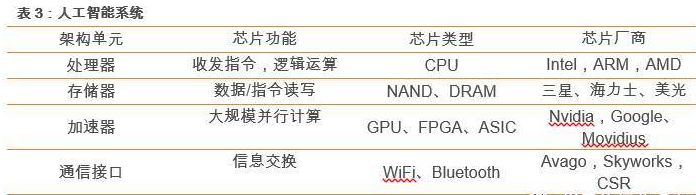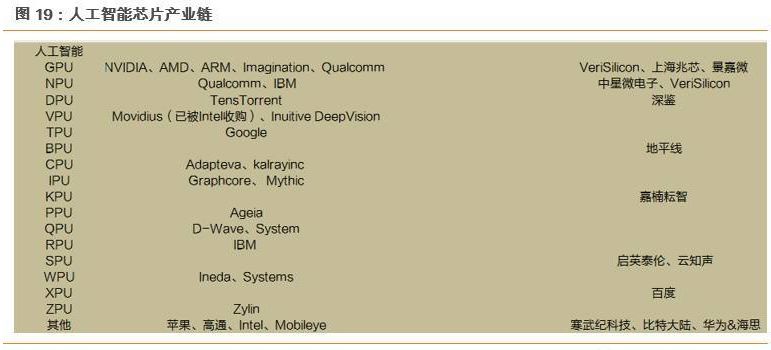 传统的芯片制造厂商:Intel,Nvidia和AMD。他们的优势在于在已有架构上对人工智能的延伸,对于硬件的理解会优于竞争对手,但也会困顿于架构的囹圄;新进入者,某些全新的架构比如神经网络芯片的寒武纪,因为是全新的市场开拓,具有后发先至的可能。新进入者的机会,因为是个全新的架构机会,将有机会诞生独角兽。