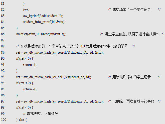 测试程序主要由test_db_micro_hash_kv()完成,在aw_min()主程序中,仅仅是简单调用了该函数。在test_db_micro_hash_kv()函数中,首先初始化了一个数据库,然后向其中添加了100个学生记录(为了快捷产生这些记录,以随机数的方式自动生成,随机数无实际意义,仅供测试使用。同时,为了保证添加的学生学号唯一,在添加记录前,通过搜索接口查看是否存在该学号的学生,若存在,则不再重复添加)。接着测试了查找接口,查找最后添加的学生记录。然后测试删除接口,删除了最后添加的学生记录,删除成功后,再次查找将会失败。最后,所有操作执行完毕,解初始化数据库。