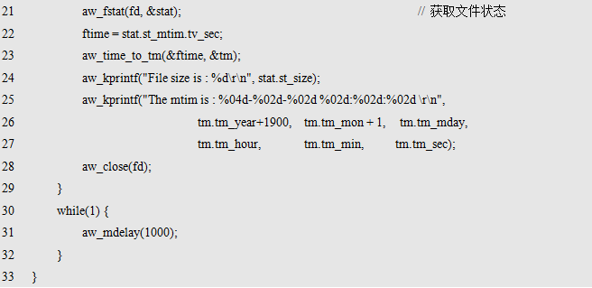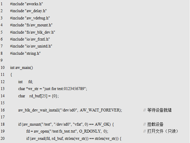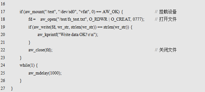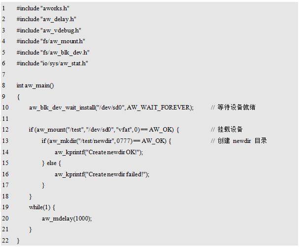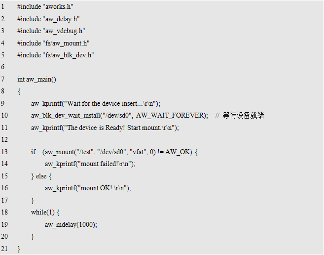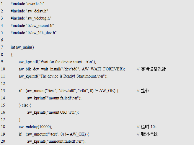 其中,mnt为挂载点,其为新建的一个目录结点,使用全路径表示,比如:"/test",其表示在根目录下创建了一个名为test的挂载点,后续访问"/test "目录即表示访问本次挂载的存储设备;dev为存储设备的名字,如果使用TF卡,则对应的设备名为"/dev/sd0";fs为存储设备使用的文件系统名,如果使用FAT文件系统,则文件系统名为"vfat";flags为挂载时的一些选项标识,当前无可用标识,预留给后续扩展使用,设置为0即可。返回值为标准的错误号,返回AW_OK时,表示挂载成功,否则,表示挂载失败。挂载TF卡的范例程序详见程序清单11.3。