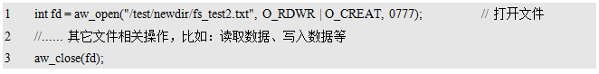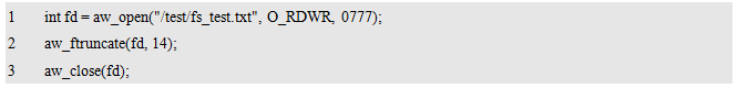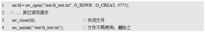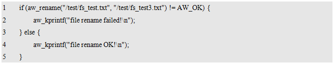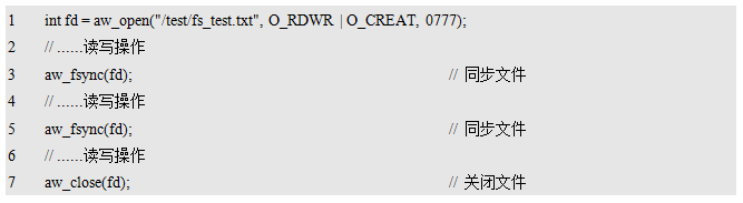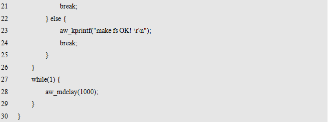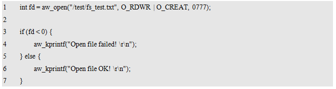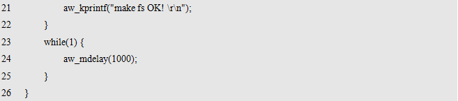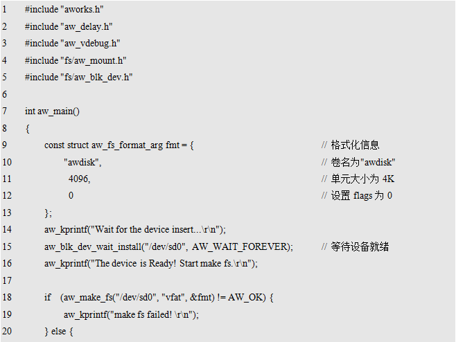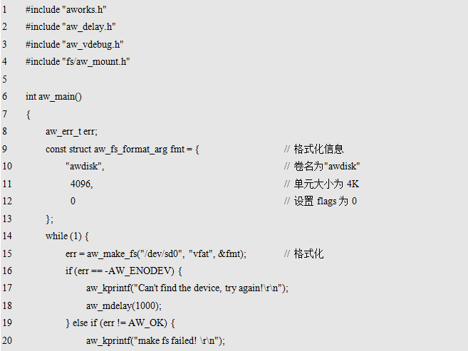 其中,dev_name为存储设备的名字,fs_name为使用的文件系统的名字,fmt_arg为格式化相关的附加信息。返回值为标准的错误号,返回AW_OK时,表示格式化成功,否则,表示格式化失败,可能是由于硬件设备不存在或文件系统不支持造成的。