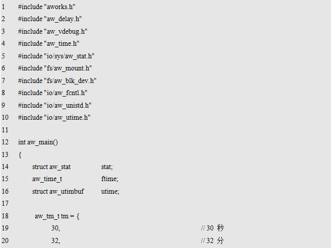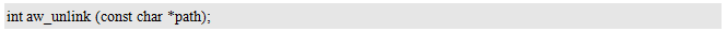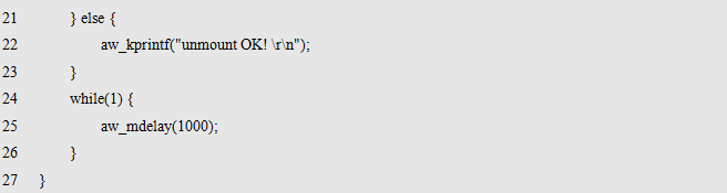 其中,path为路径名,可以是设备名(比如:"/dev/sd0"),也可以是挂载点(即挂载时指定的mnt参数,比如:"/test")。flags为挂载时的一些选项标识,当前无可用标识,预留给后续扩展使用,设置为0即可。返回值为标准的错误号,返回AW_OK时,表示取消挂载成功,否则,表示取消挂载失败。取消挂载的范例程序详见程序清单11.4。