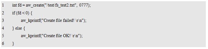 其中,path为包含文件名的完整路径,如需在test目录下创建一个fs_test.txt文件,则path应为"/test/fs_test.txt",文件名建议使用8.3格式,即主文件名长度不超过8,扩展名长度不超过3。因为部分文件系统不支持更长的文件名,使用8.3格式的文件名兼容性更好。