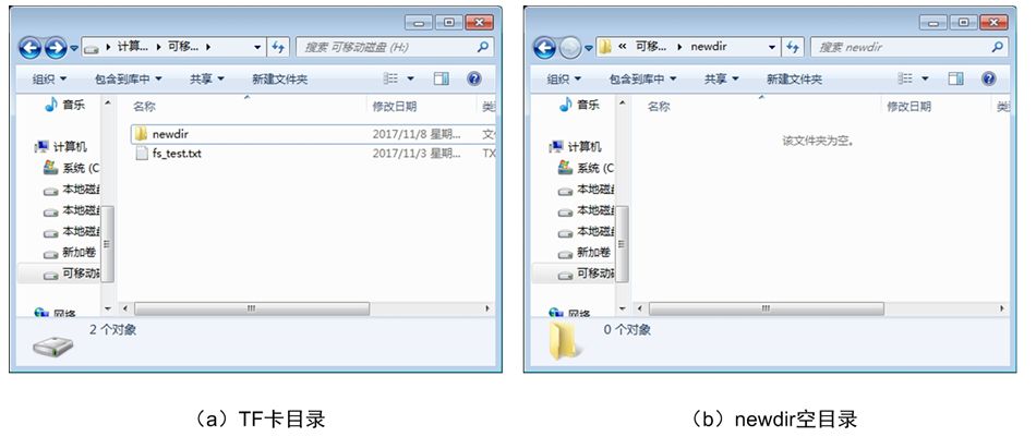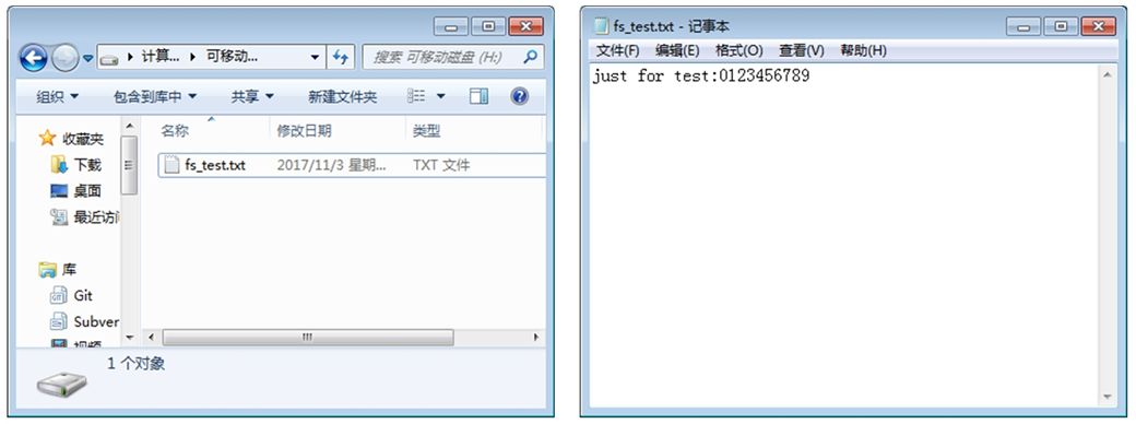 若程序运行成功,则在TF卡中创建了一个fs_test.txt文件,同时,在文件中写入了字符串"just for test:0123456789"。为了验证操作是否成功,可以拔下TF卡,将TF卡通过读卡器连接到PC上(Windows系统),通过PC查看TF卡中的内容,可以看到TF卡目录内容和fs_test.txt文件内容详见图11.3。