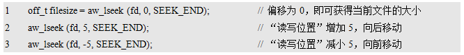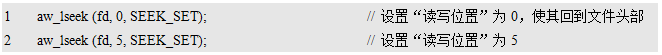 对于每个打开的文件,都有一个“读写位置(相对于文件起始位置的偏移量)”来表示下一次读/写数据时的起始位置,其值除在每次读/写数据时自动更新外,还可以使用aw_lseek()函数手动改变,aw_lseek()的函数原型为: