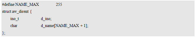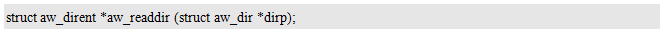 其中,dirp为指向目录对象的指针,可通过打开目录获得。返回值为目录项指针,即为本次读取的一条目录项,其类型struct aw_dirent的定义如下:
