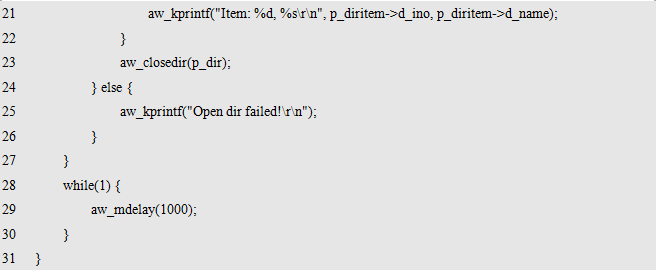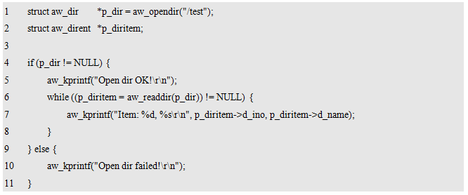 其中,dirname为目录名,如需打开根目录下的test目录,则其值为"/test"。返回值为指向一个目录对象的指针,目录类型struct aw_dir 在io/aw_dirent.h文件中定义,其具体定义用户无需掌握,仅需保存下该指针,后续使用该指针代表打开的目录即可,特别地,若返回值为NULL,则表示目录打开失败。打开目录的范例程序详见程序清单11.21。