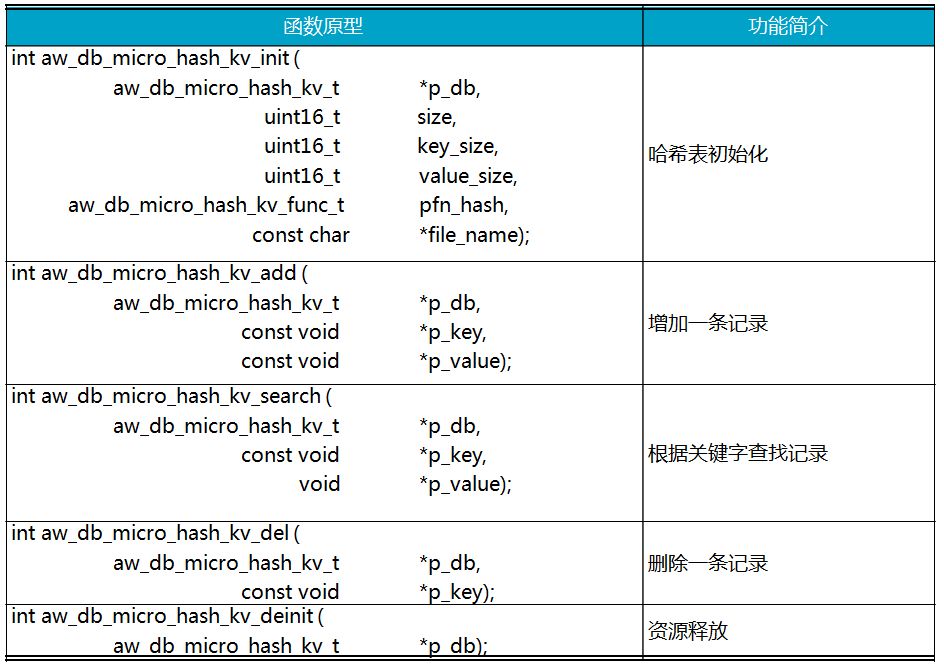 微型数据库相关的文件和接口以“aw_db_micro_hash_kv”作为命名空间,其中,“aw_”表示AWorks,“db”表示数据库(data base),“micro”表示微型,hash_kv表示基于的是hash关键字和值的思想。
