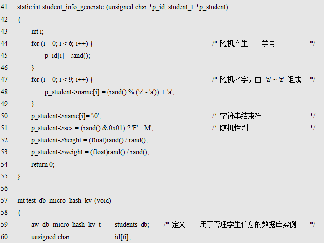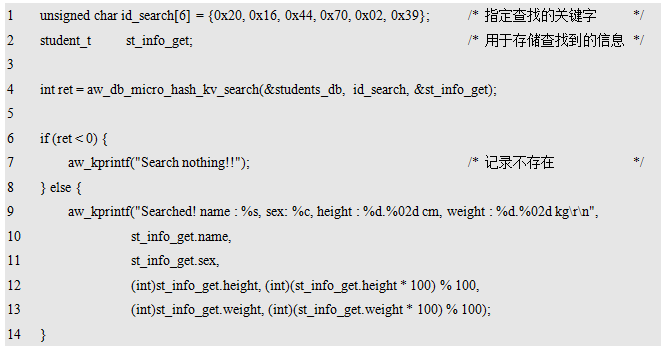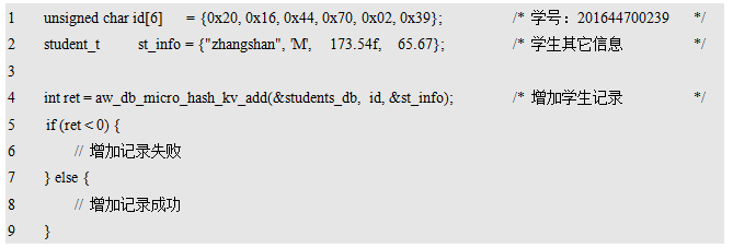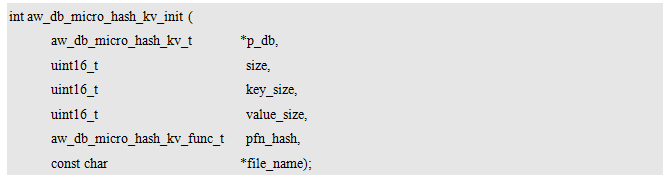 aw_db_micro_hash_kv_t类型的指针,用于指向待操作的数据库实例。该类型的具体定义(如具体包含哪些成员)用户无需关心,仅需在使用微型数据库前,使用该类型定义一个数据库实例即可,例如:
