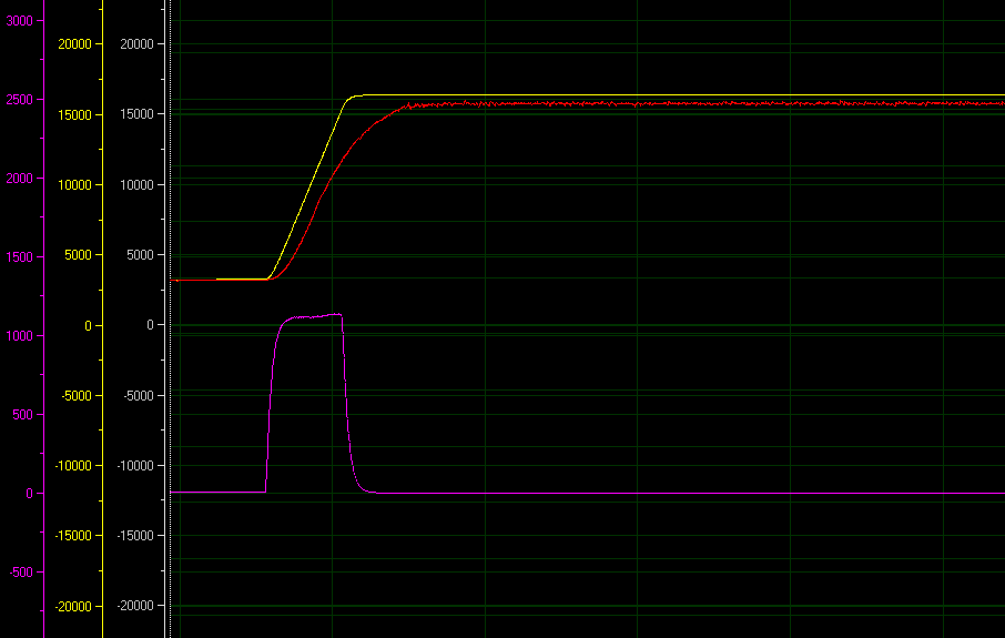 图2显示电机的加速过程。黄线是目标速度,它的加速度、最高速都非常大。红线是实际速度,它已实时地跟进目标速度,但无奈能力有限,加速开始就明显滞后目标值,最终的速度也不够高。粉线是驱动电流(电流越大加速度越大),电流在加速阶段一直保持最大值,说明驱动器已经尽力了,用了最大的电流,但电机的加速度还是跟不上。如果要加速度上去,只能更换驱动器或换电机了。