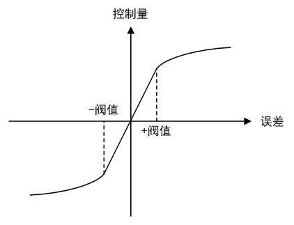 ADRC控制快,最主要的一点是“状态误差反馈控制律”使用了“大增益控制”,相当于PID的比例系数P很大。图2是ADRC的“状态误差反馈控制律”常用的控制曲线,横坐标是误差(目标值-实际值),纵坐标是误差对应的控制量。工作时,误差一般控制在“+阀值”和“-阀值”之间,这一段曲线的斜率很大,也就是说增益很大,只要出现一点点的误差,就输出很大的控制量,具有很强的跟踪能力。但是如果误差超过“+阀值”或“-阀值”,增益还是如此大,系统就可能出现超调、震动等不良现象。所以超过“+阀值”或“-阀值”后,要降低增益,即斜率要减少,避免超调和震动。